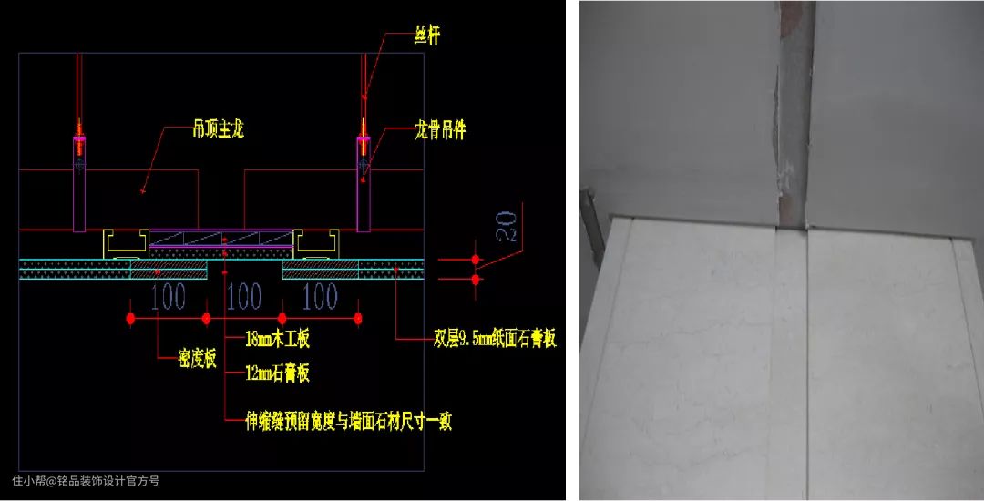 8、石膏板吊顶长度超过15米的各类走道或大面积吊顶转角处应预留伸缩缝,且伸缩缝两边应设置独立的主龙骨、副龙骨。
