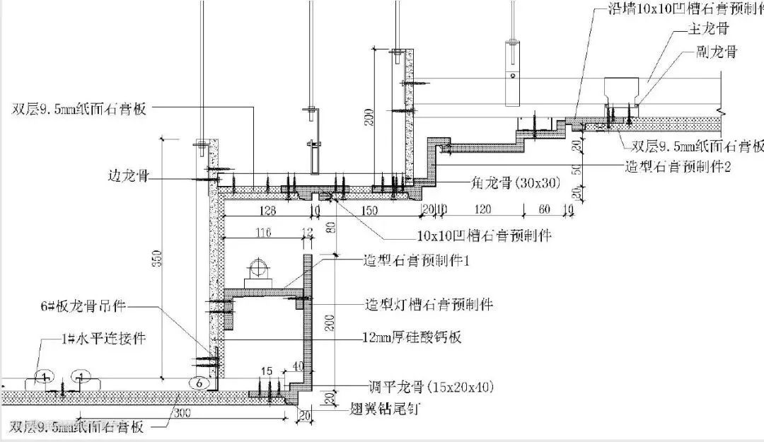 3、双层、有叠级或灯槽造型的吊杆,应将间距控制在≤1000 mm。
