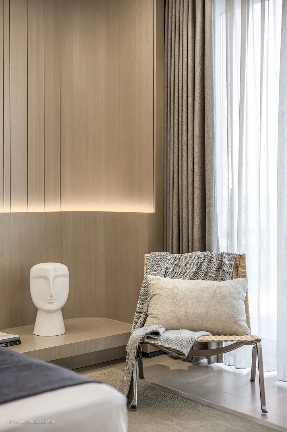 ▲床头墙的靠背区域装上带有暗藏灯带的设计,上方两盏筒灯烘托,在无主灯的空间下,也是显得更加温馨舒适而明亮大气。