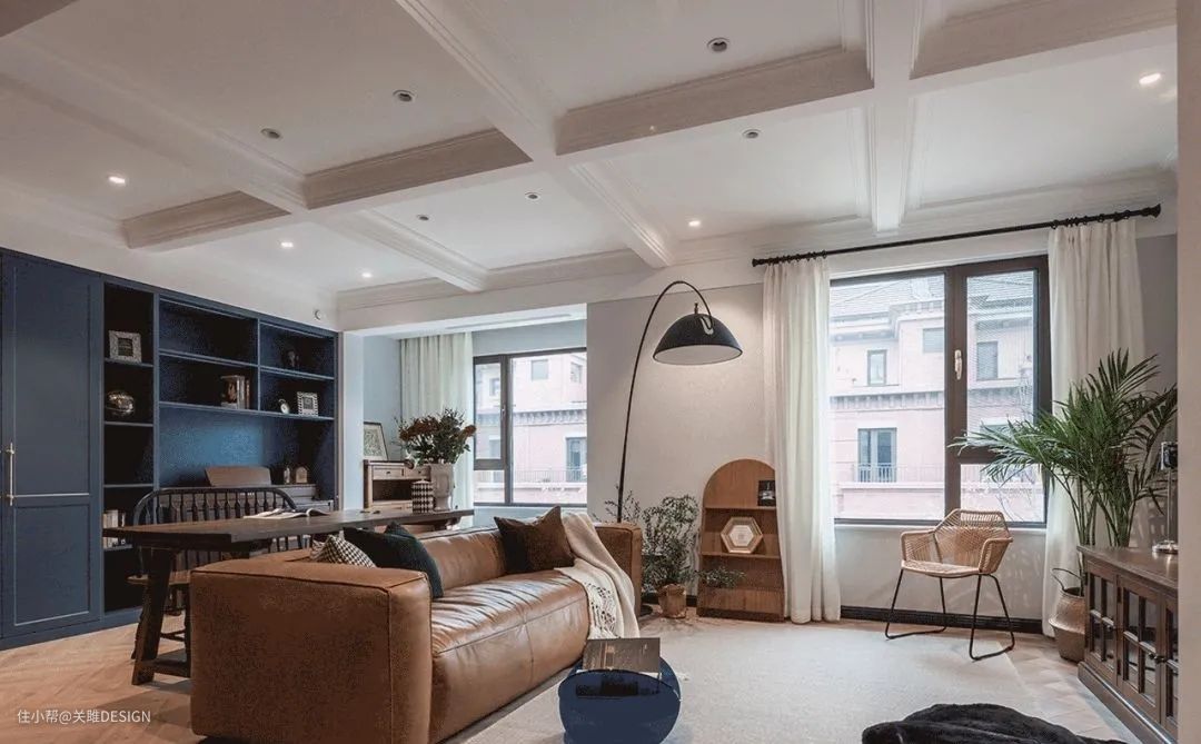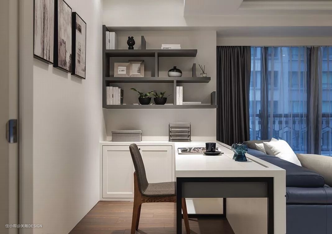 书桌与书柜是书房的标配,书桌靠沙发,那么可以利用一面墙打造书柜,以满足书籍与收藏品的收纳与展示功能。