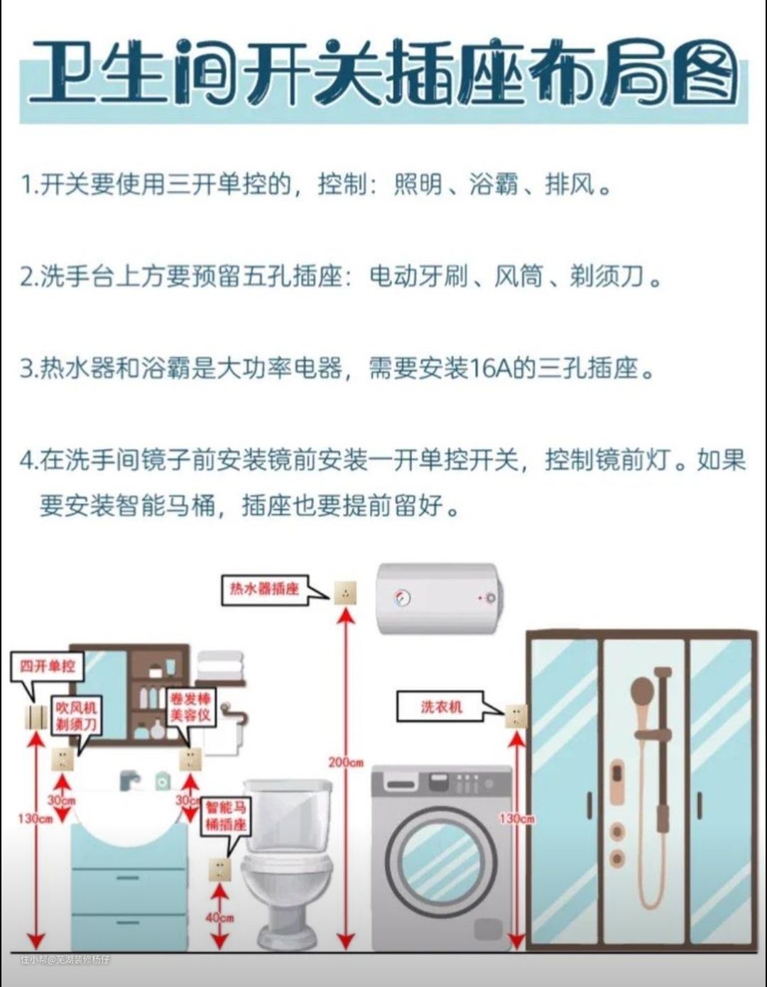 1:提前规划好家具、灯饰、电器、中央智能设备、开关的位置尺寸、确定马桶、洗浴区、地漏、台盆、洗衣机的位置尺寸和排水方式。