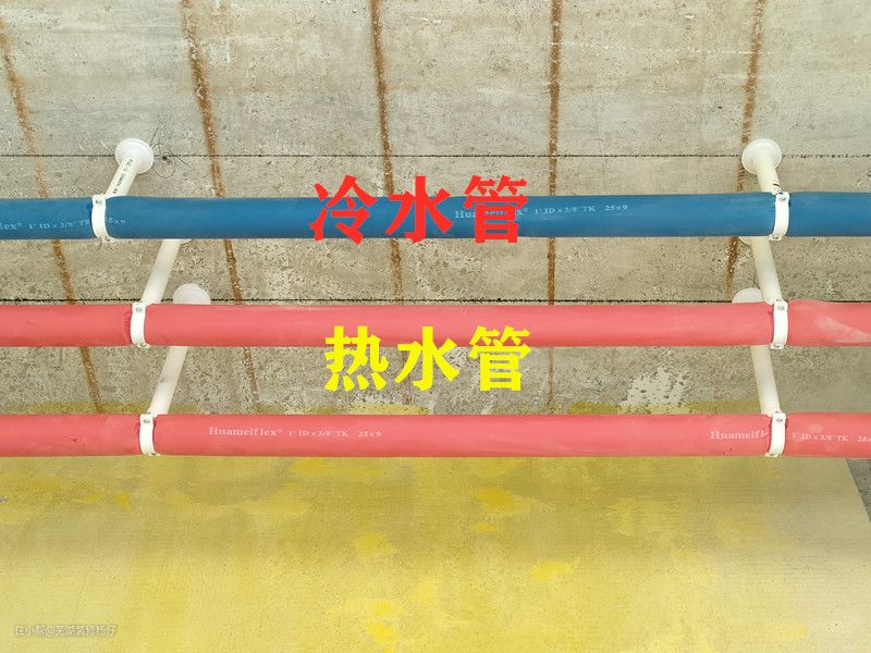 6、冷热水管套上保温棉,热水管套红色,冷水管套蓝色,避免因温差产生冷凝水