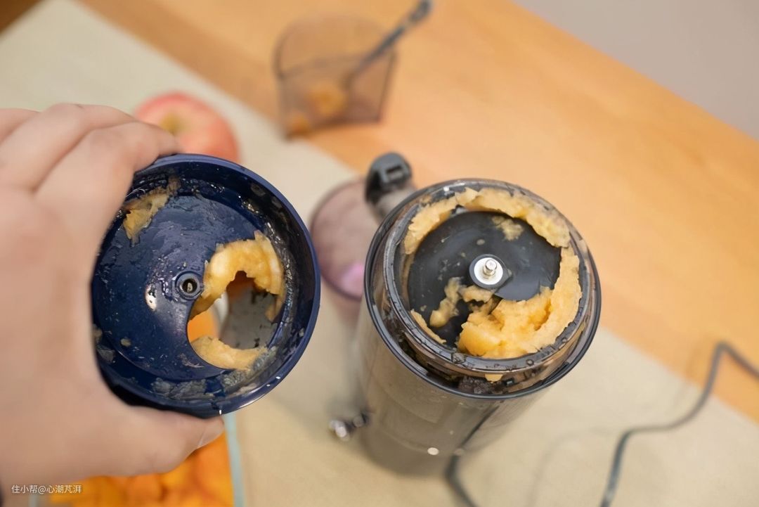 ▲这款原汁机体积小,容量大,部件少,缺口对位,易拆解部件清洗拆洗简单,无滤网无刀片不伤手,安全可靠,清洗简便,一冲即净。(和家里榨汁机清洗做了对比)