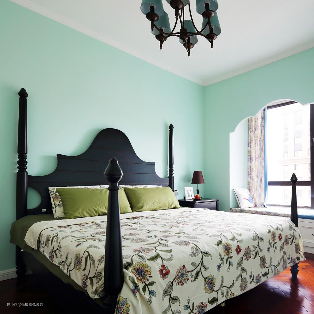 房间以绿色作为主要元素,进行冷暖色调的延展,墙面是冷色调的绿给人以宁静的感觉,床饰偏暖色调的草绿色为主搭配碎花的元素,形成一幅清新自然的的温暖画面,让居住者可以感受平和、舒缓身心的色彩能量。