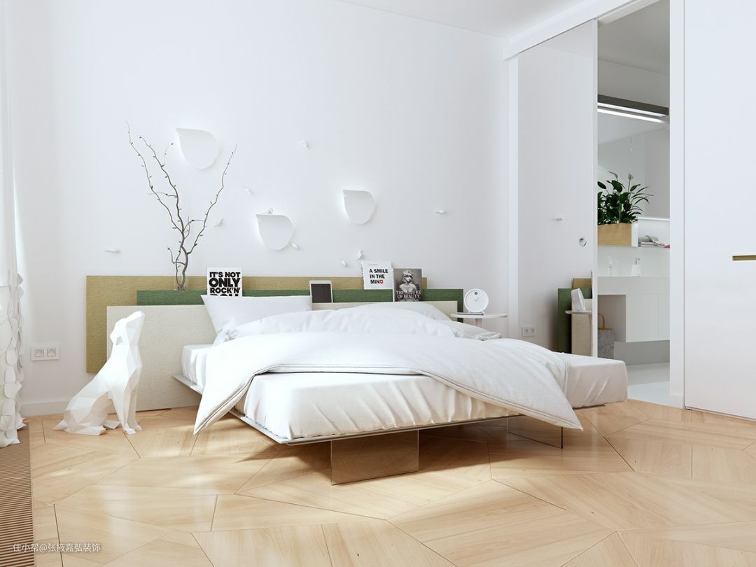 以大量的白让睡眠空间回归极简、单纯,只简单在床头点缀以卡其色和墨绿色相间的床头板做出颜色对比层次,形成空间视觉重点,使得简约的空间设计不那么苍白单调,替简约现代空间带来灵动,但不过度喧嚣的宁静氛围。