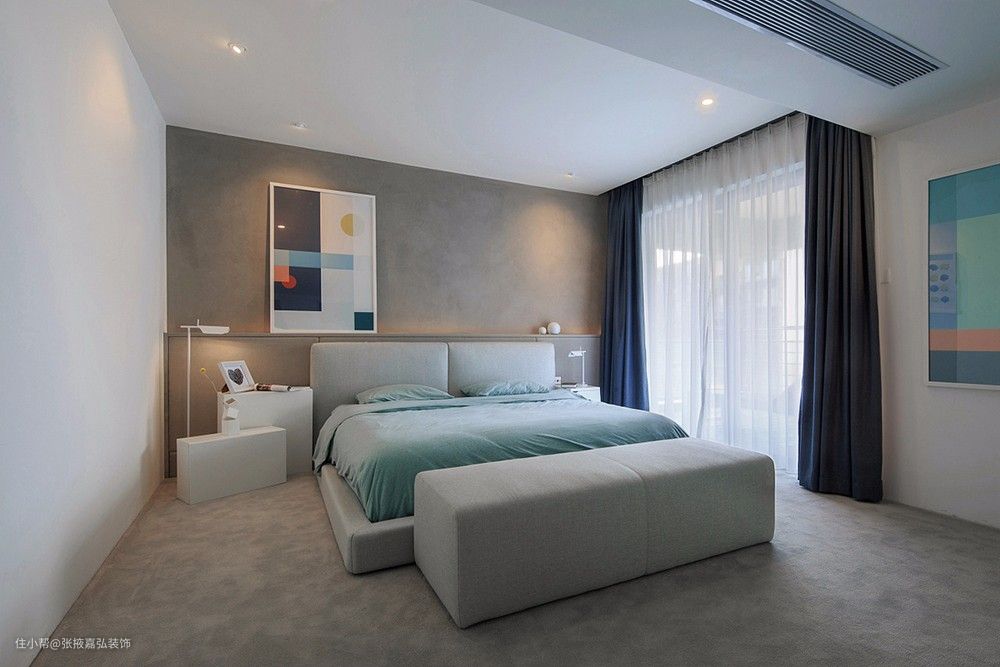 卧房以不规则的几何图案作为墙面的背景效果,造成空间感,给人以随性自由的感觉。灰色作为主色调营造了一种极简的休闲感,湖蓝作为点缀使得空间不过分单调。