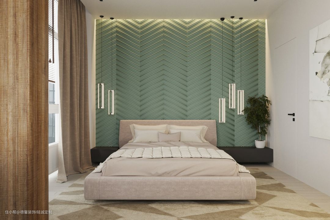 背景墙做出凸出部分充当床头,不仅简洁明了,还让整个空间增强了层次与立体感。