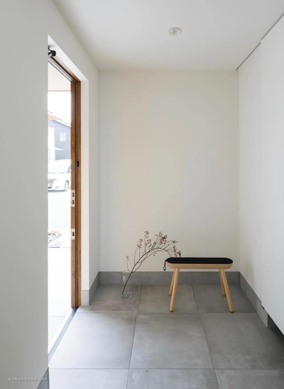 玄关是从室外回家后进入的第一个空间,以灰色地砖铺设玄关的地面,也是可以提供一个耐脏而又简约大方的回家仪式感。