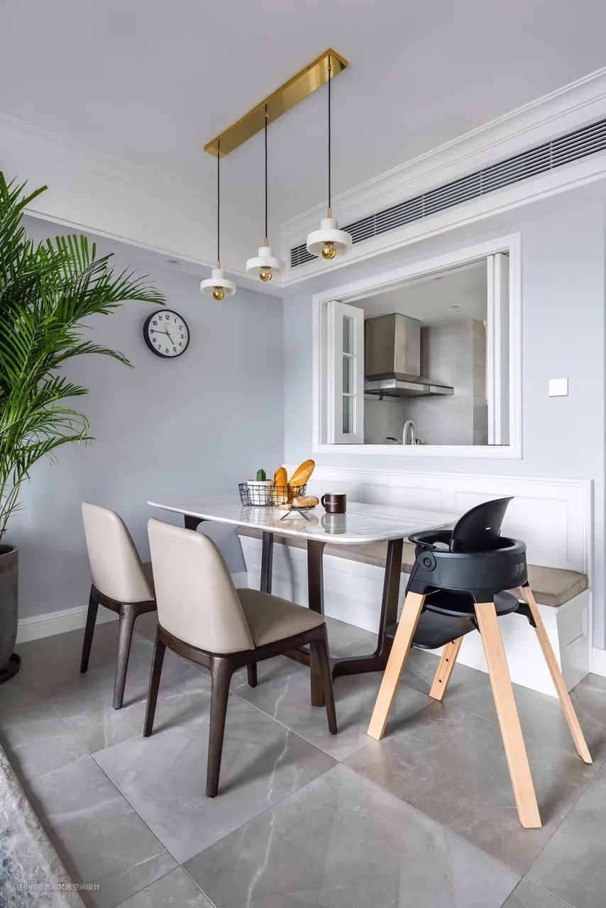 厨房作为加了一个相对紧凑的空间,地面铺设哑光防滑的灰色地砖是非常常见的选择,这样整体地面更加耐脏,设计效果也是非常简约大方。