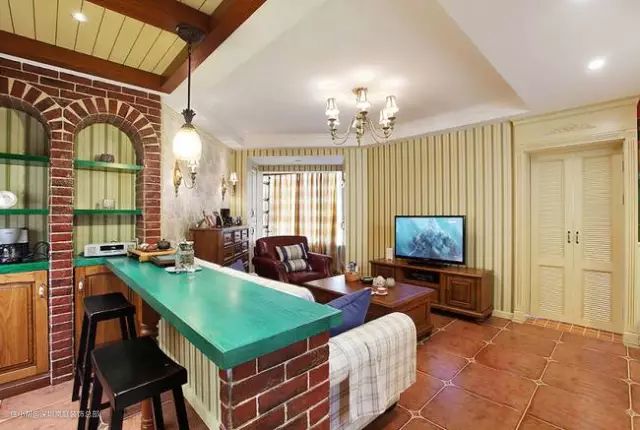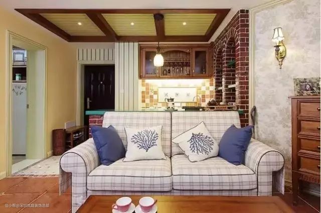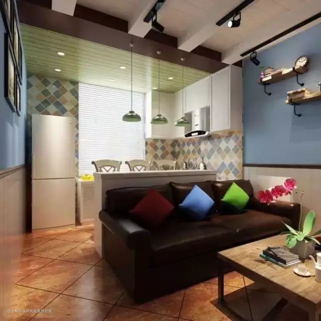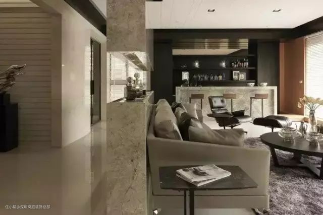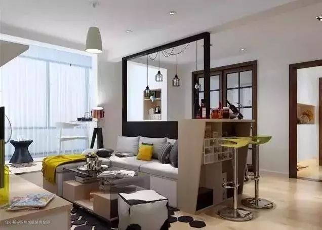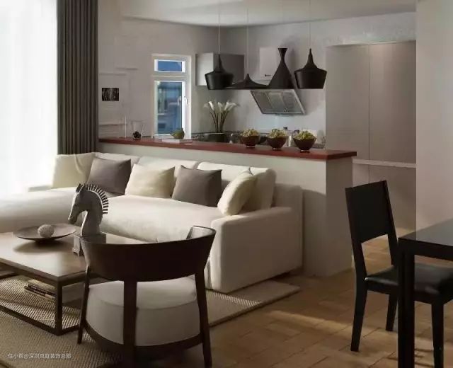如果家中有个小吧台,沙发就可以这样如下图那样摆放,其实还蛮有小资情调的,小空间也能别有风味。