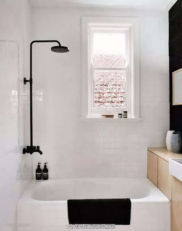值得一提的是黑色瓷砖的运用,白墙中长长一条黑色,让空间有一种纵向延伸感,而且,作为淋浴器的背景墙,更突显银色五金件的光亮质感。