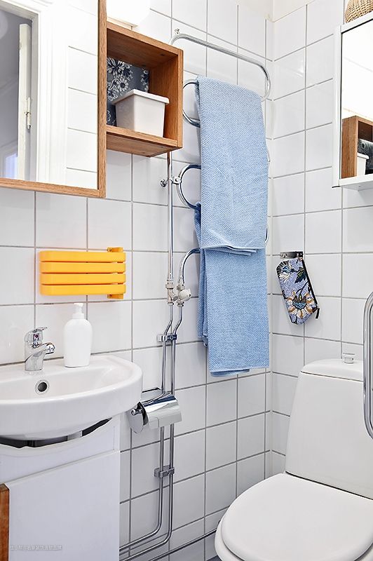 1 ▲ 洗手池和马桶上各有一个镜柜,再加上拐角处的加热毛巾架、水池上的旋转毛巾架,空间利用的十分到位。