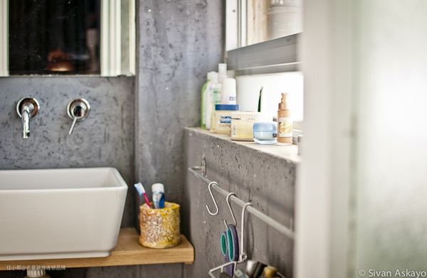 19 ▲ 谁说卫生间就要冷冰冰?粗犷的画风和黑墙那么相配,画下的台面还可以放东西。