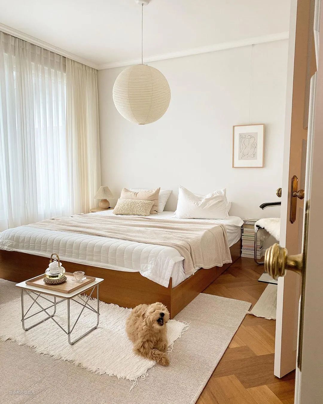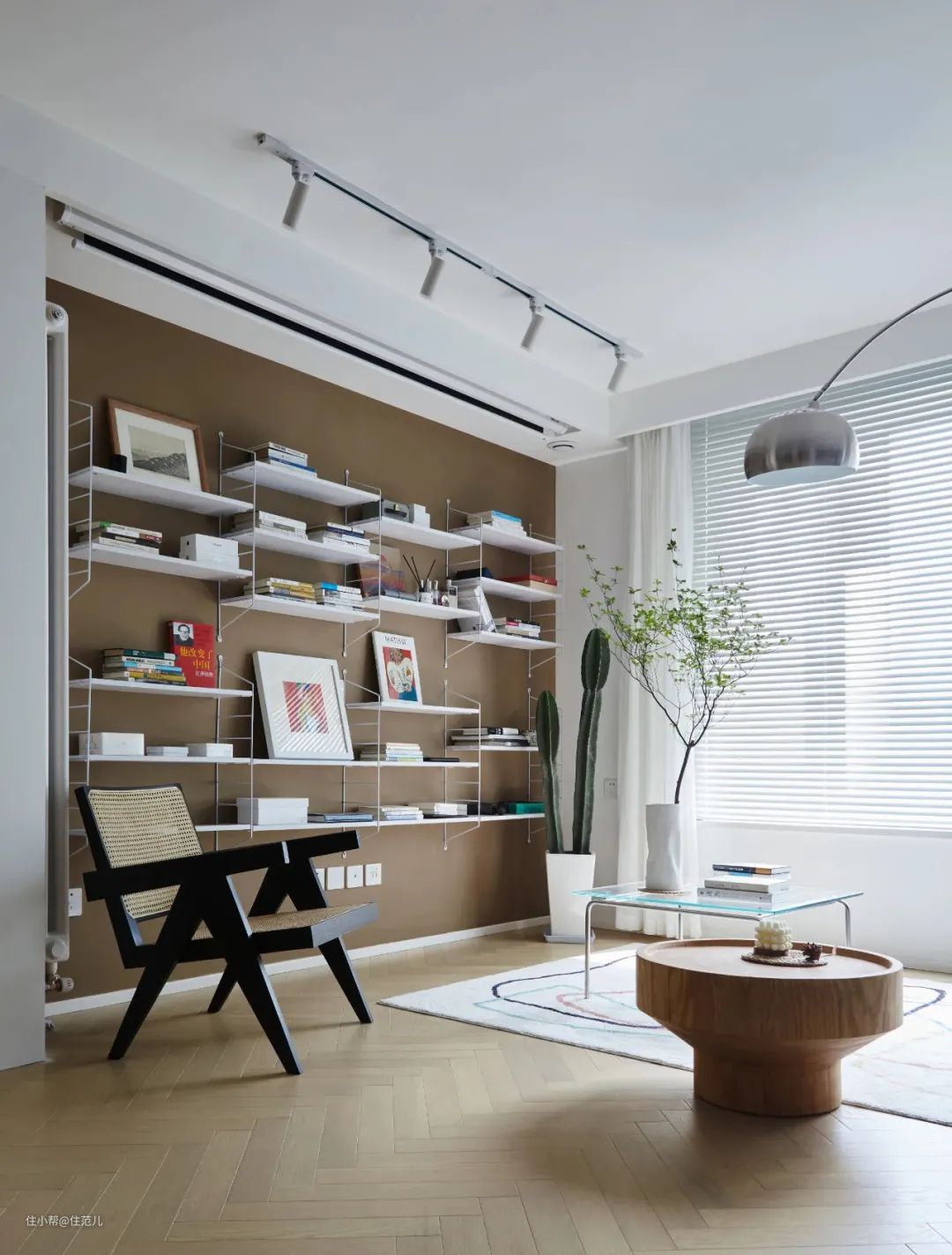 地面用橡木地板肯定不会出错,温和木材配温和墙面色,讨巧又高级。
