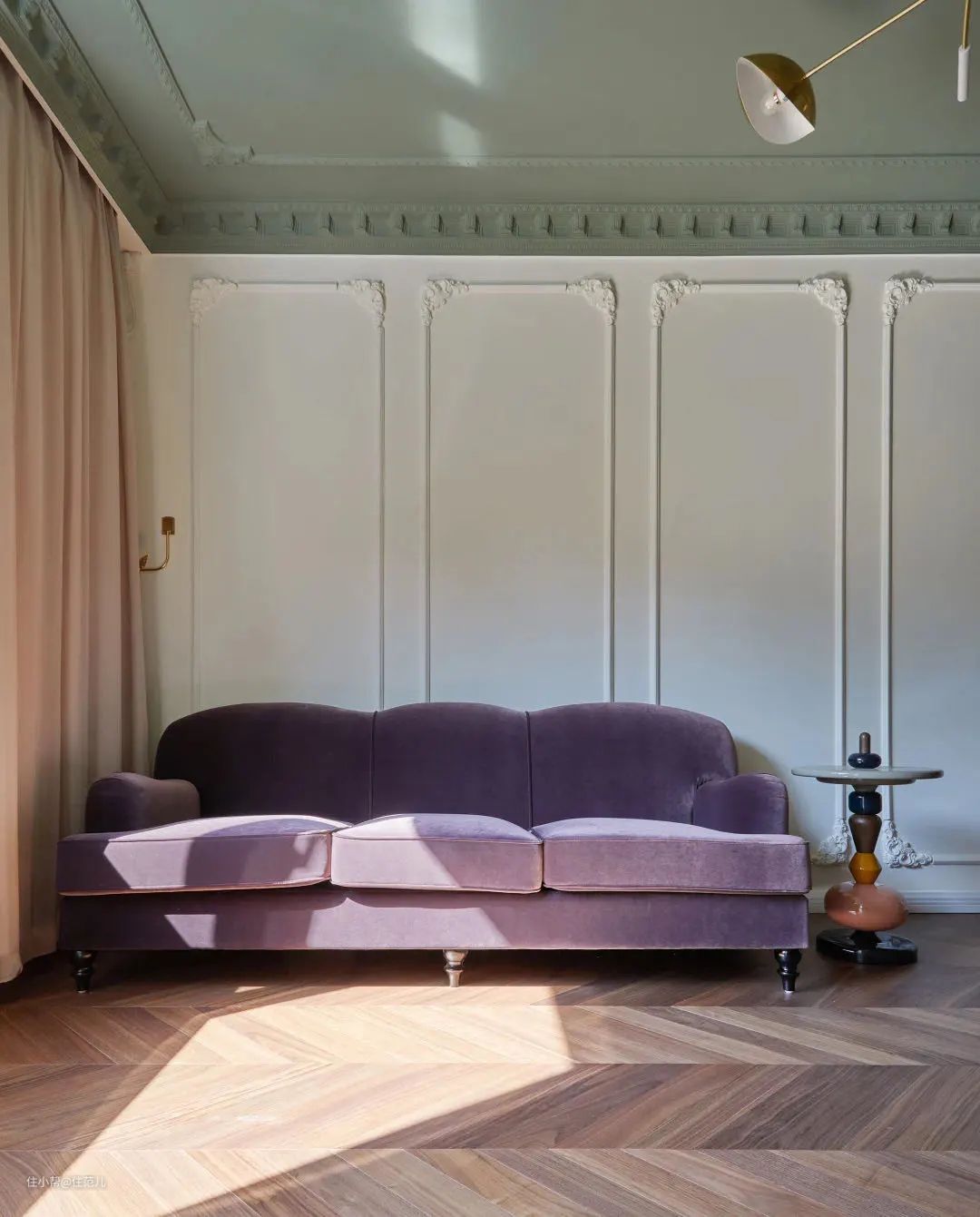 像这个客厅设计,肉色、灰绿色、淡紫色都占了很大面积,但我们不能单一考虑色彩了,决定整体和谐性的还有材质搭配、墙上的装饰细节,完全属于超纲范畴。