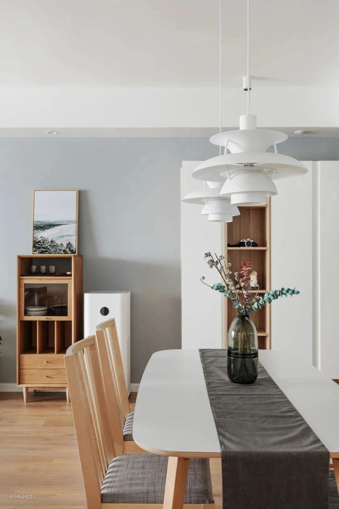 莫兰迪色系和浅色原木非常搭,家具在黑白以外可以选浅色实木。