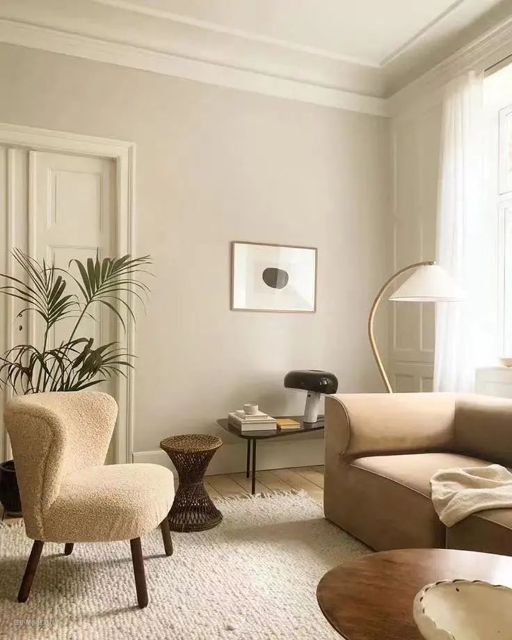 奶茶色系和莫兰迪色系一样,都追求灰蒙蒙的调子,但是它只在黄色这一种色相里面做文章。奶茶风的打造,一般会在墙面铺上一层浅浅的米色打底,然后选择深2个色度的地板或地毯,来作为背景色。