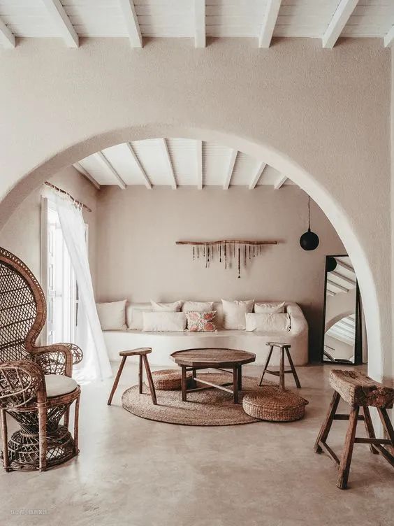 顶面的圆弧造型与墙面的拱形门洞,在视觉上呈现出流畅之感,不同于直线造型的转折死板,侘寂风的造型更加优美。