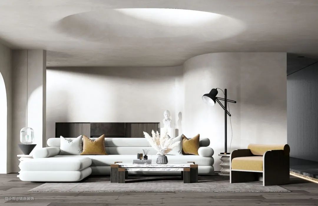 侘寂风在一定程度上遵循着解构主义的设计原则,用分解的概念,将部件进行叠加、重组,对整体呈现出一种分散却又统一的不确定感。侘寂风的设计中弱化了空间中的线面穿插感,为了使空间视觉上更加柔和纯粹,曲线和曲面的运用非常广泛,将各种角度的曲面重组叠加,呈现出优雅的弧度,就是侘寂设计在结构中所需要注意的地方。