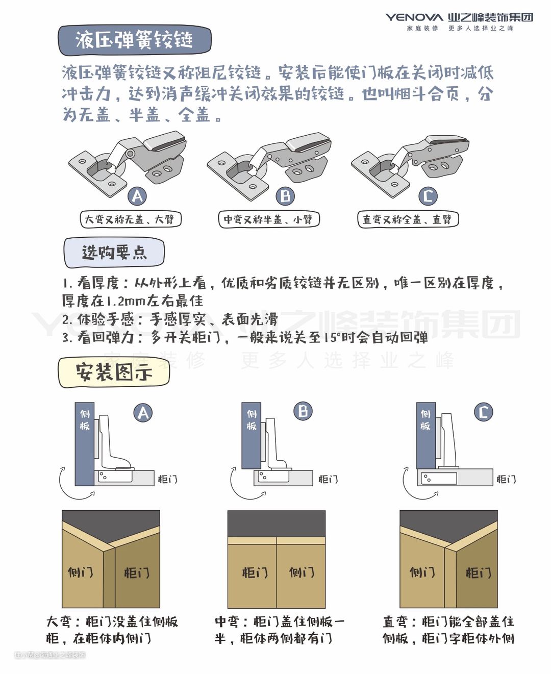 铰链、滑轨、拉篮、拉手、撑杆。这些配件的挑选主要从材质、规格、品牌等方面着手。