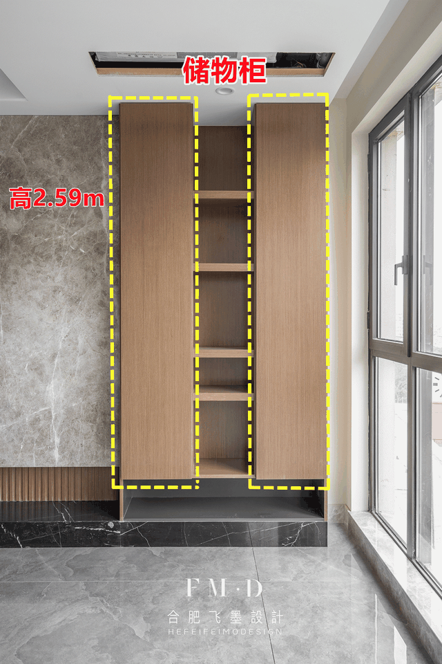 上方的悬空储物柜高度为2.59m,直接装到顶,分散在2边,平时用来放放书籍或者其他杂物,收纳直接翻了倍,同时柜门一关,也能保持清清爽爽,可以说把阳台靠墙区域给利用到极致了。