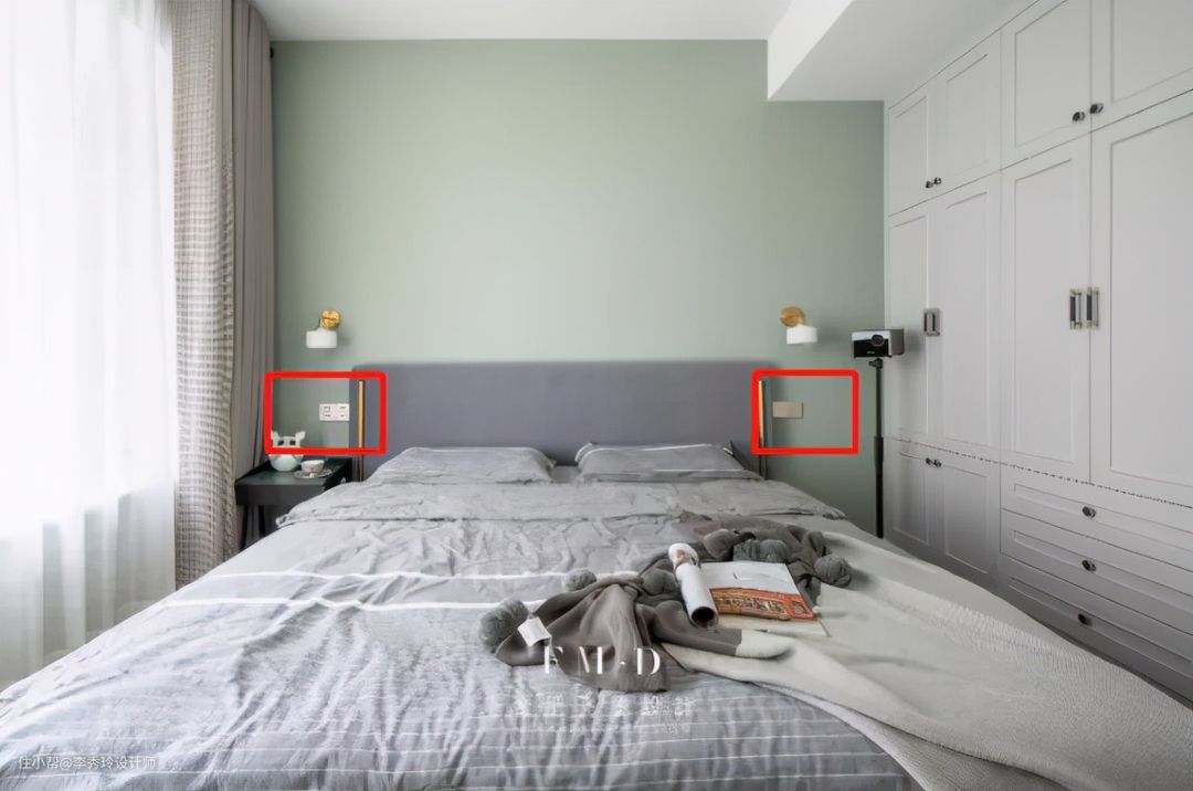 - 卧室床头的插座建议根据居住人口来留,如果住2个人,建议两边各留2个,住1个人,两边共留2-3个,方便手机充电、台灯插座。