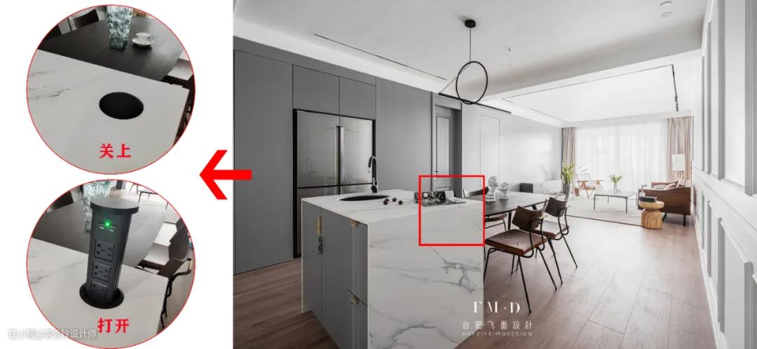 - 台面插座的位置可以选岛台侧面,或岛台角落,不要耽误台面功用。选择设计在台面上,可以选按压式的隐藏插座。