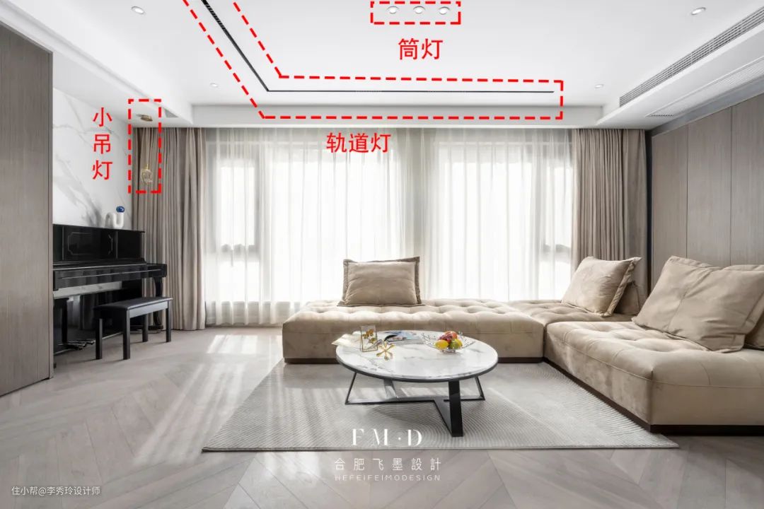 ①客厅想要照明无死角+一点点氛围,灯具通常有主灯/筒灯+磁性轨道灯+灯线/小吊灯,各自设计开关即可。