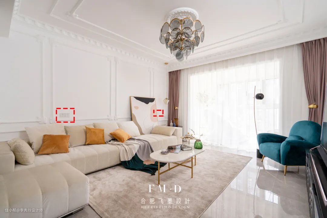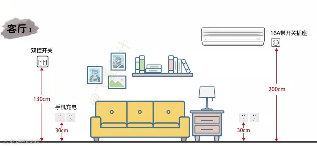 ②沙发两边各留2个5孔插座,方便手机充电和台灯/落地灯使用。