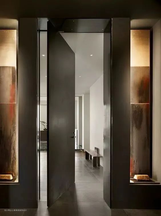 这是很普遍也是很简单的方式了,把门的颜色材质和墙面一样,基本上就可以了,再配点线条之类,让门与墙融为一体。