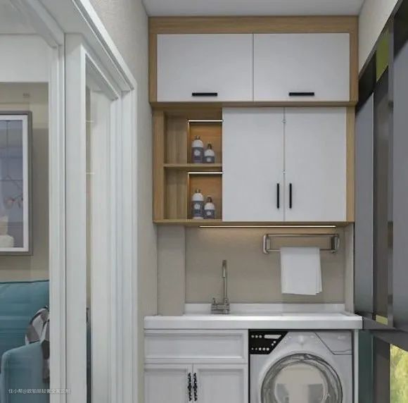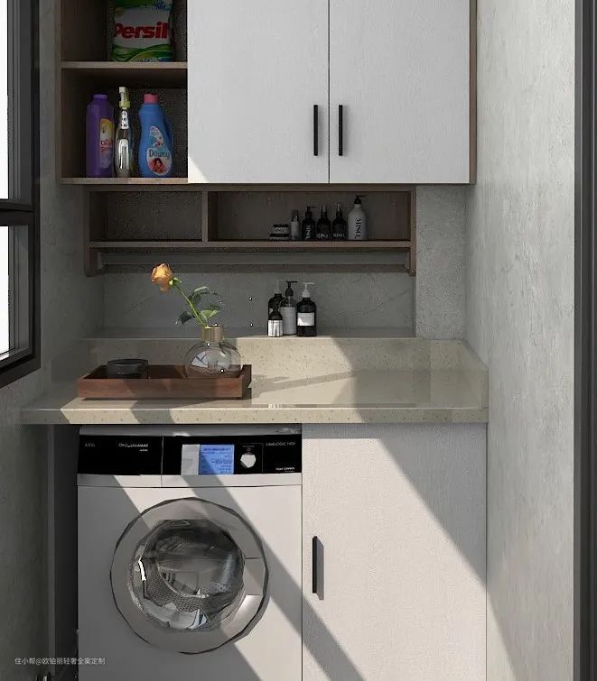 承重柱不在边角,就立在进门处?也有办法!定制的柜体包裹梁柱,与之融为一体。既是玄关柜又当餐边柜,完美隐藏承重柱,一举三得。阳台可别再用塑料绿萝遮掩水管和柱子了。用阳台吊柜包覆起来,规划出独立洗衣区,视觉效果高级,功能也更实用。