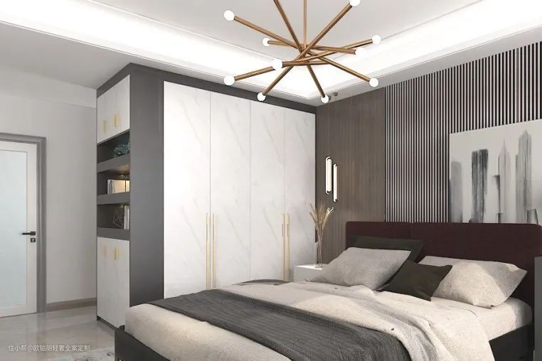 不仅如此,好好规划布局,还能利用承重梁柱隔出无人能抵抗的衣帽间!巧用卧室内的书柜和衣柜,隔断出一个小空间,生活的质感就是从点滴小细节积累起来的。