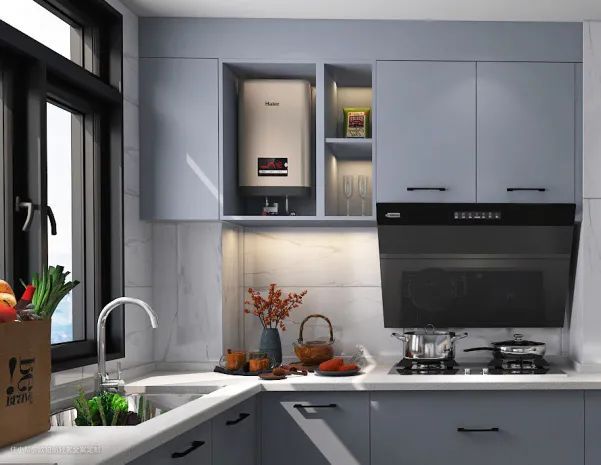 厨房也是同样的道理。利用转角加装吊柜,包覆隐藏承重柱;或者通过加装切角吊柜避开,也是可行的。