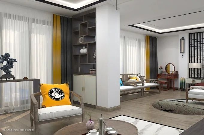 如果梁柱位于几个空间内,不用急着说糟糕。像下图这种,沿着承重柱加上储物柜,就能达到对室内空间进行使用功能分区的效果,保证不同空间的相对独立性。