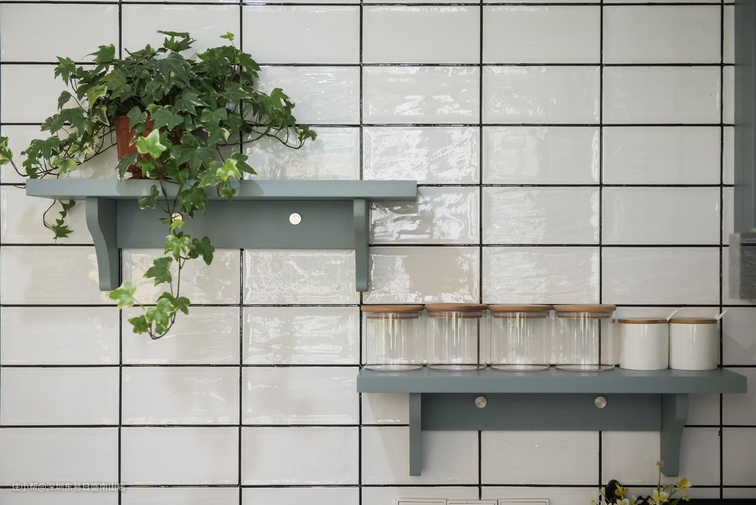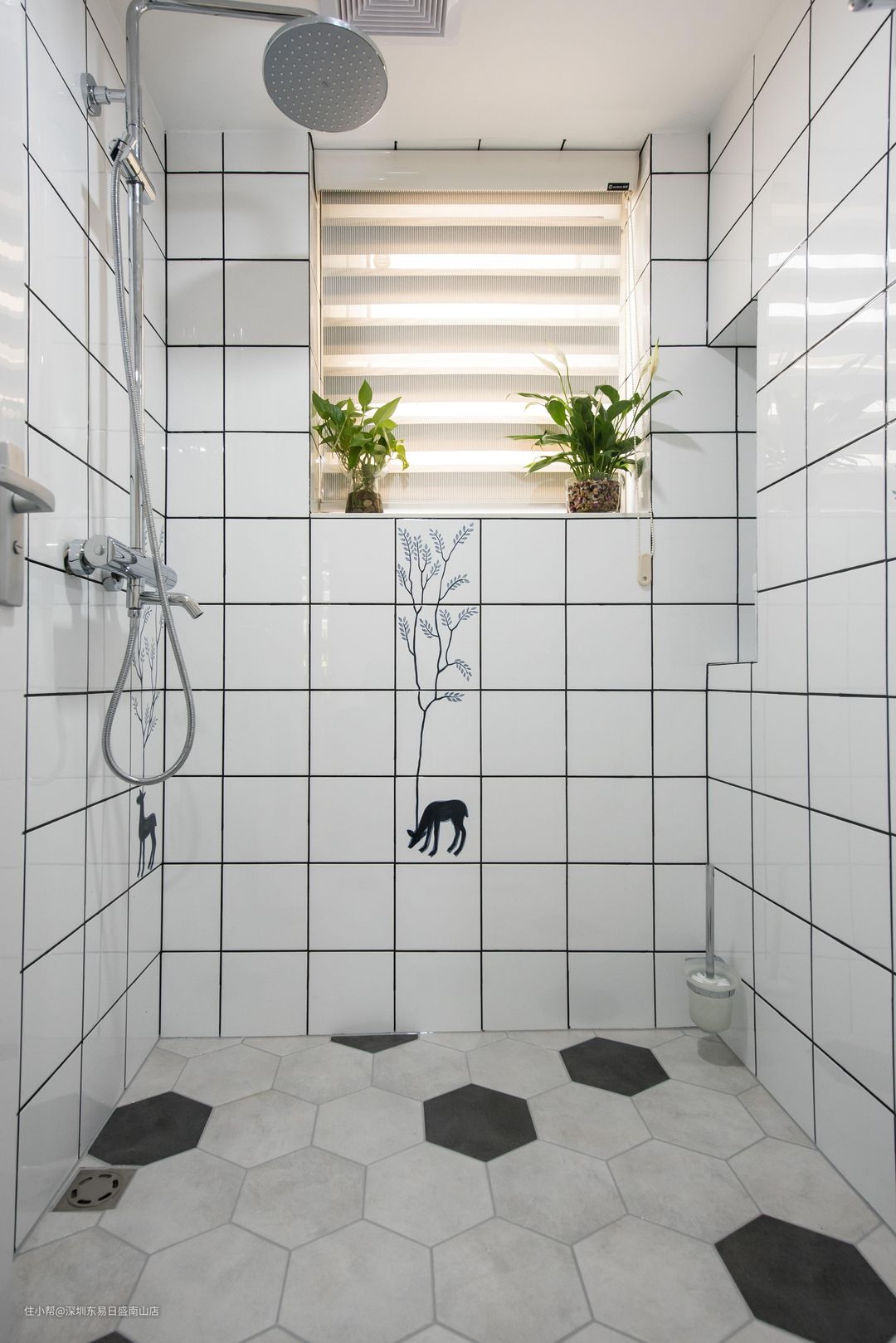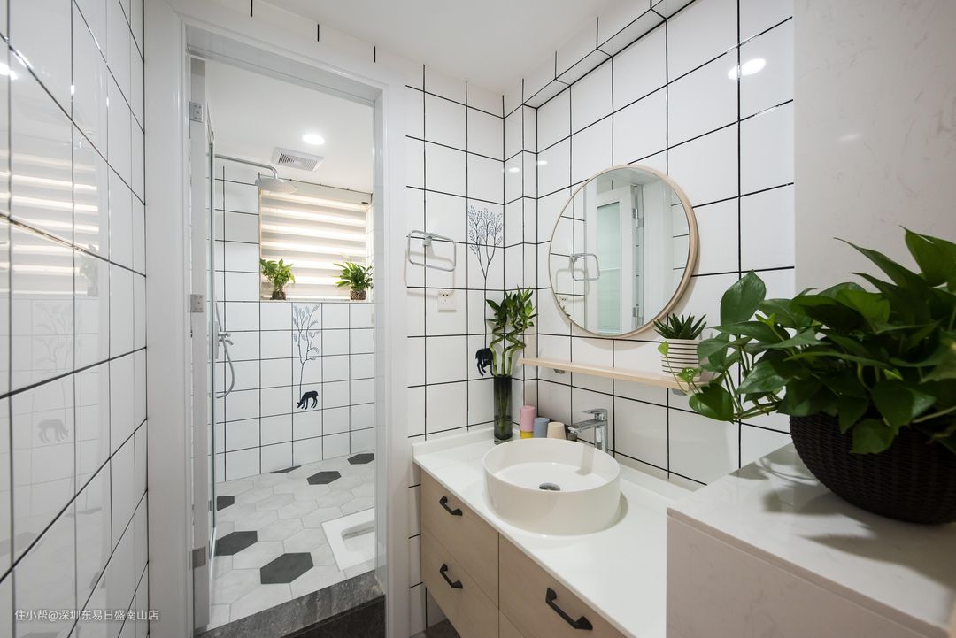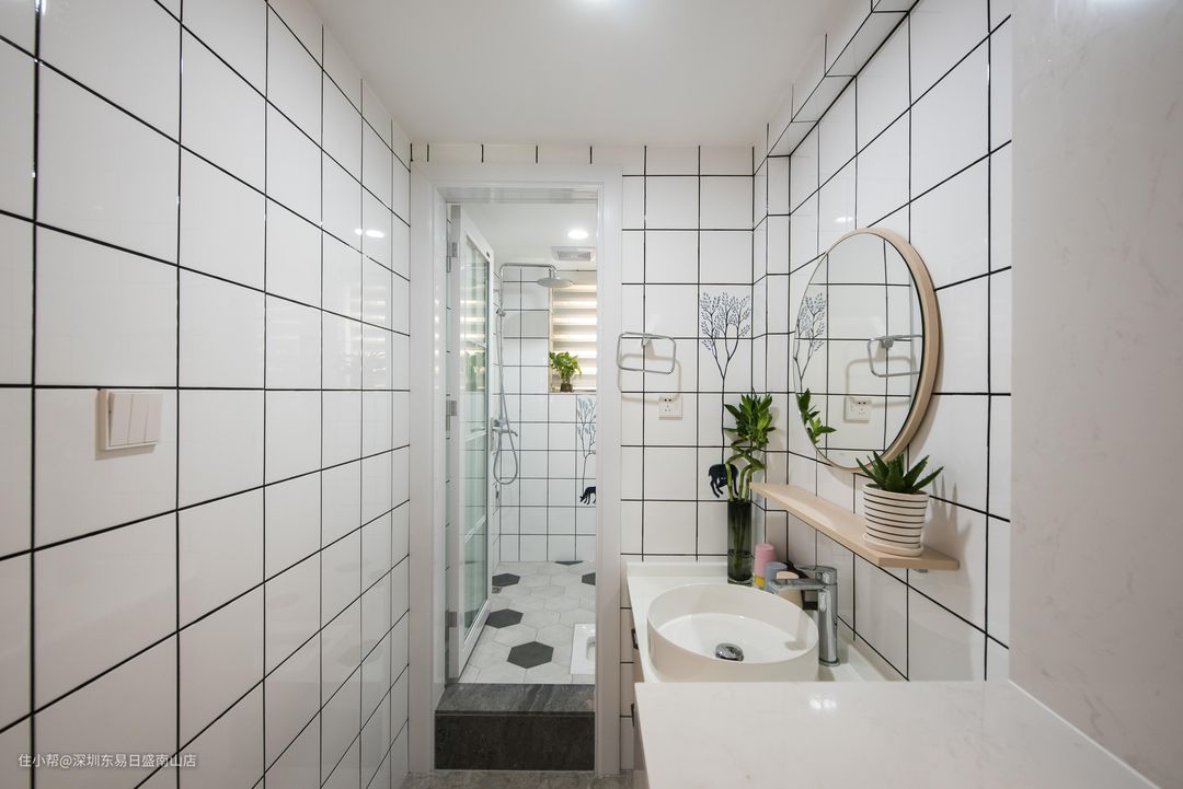 洗手间和过道之间的墙做成矮墙,矮墙上可以放置物品及绿植目的是为了扩大空间,也增加了活动范围。