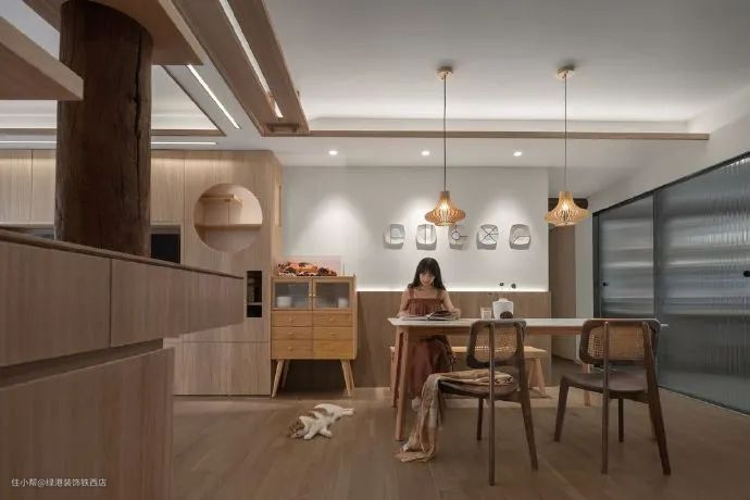 进门看向客厅视角,整个空间采用了原木风来定位的,看起来相当的佛系。用猫爬架当作玄关柜+隔断+换鞋柜的设计很巧妙,充分满足了户主人猫共处的需求,隔断中的圆柱木头设计,也再一次提高了空间的自然清新韵味,且为猫咪增加了玩耍的趣味性。与此同时,我们可以看到,吊顶部分也设置了猫咪的行走通道。