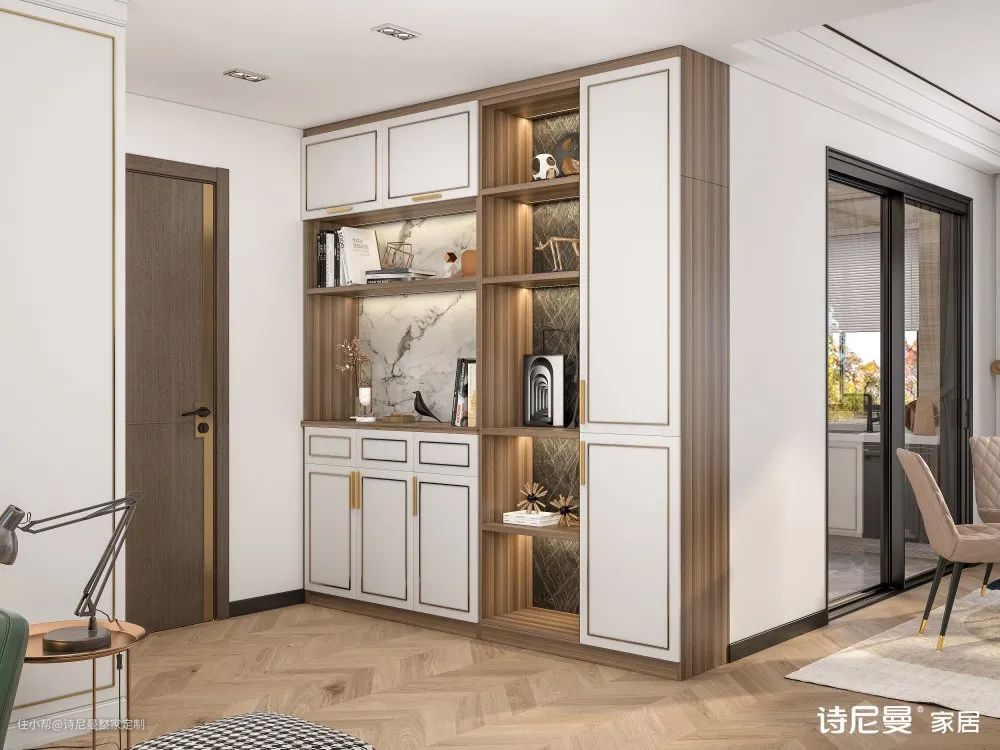 装上护墙板的客厅总能提升客厅档次,与电视柜相互呼应。做一列内嵌式书柜,以长城板作背板,灯光带柔和地打在自带纹理的长城板上,让书柜变得充满格调与韵味。