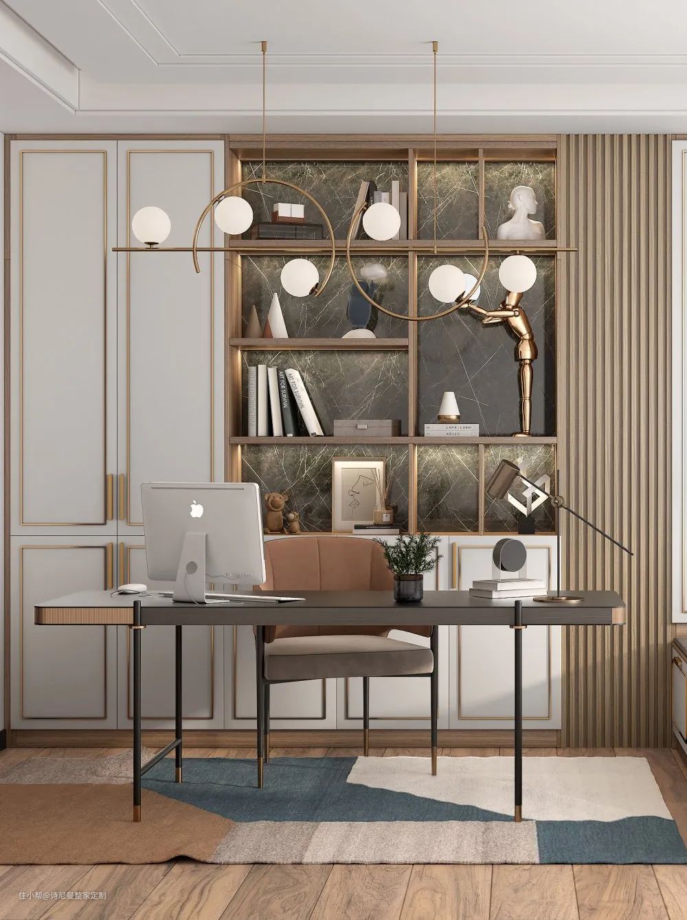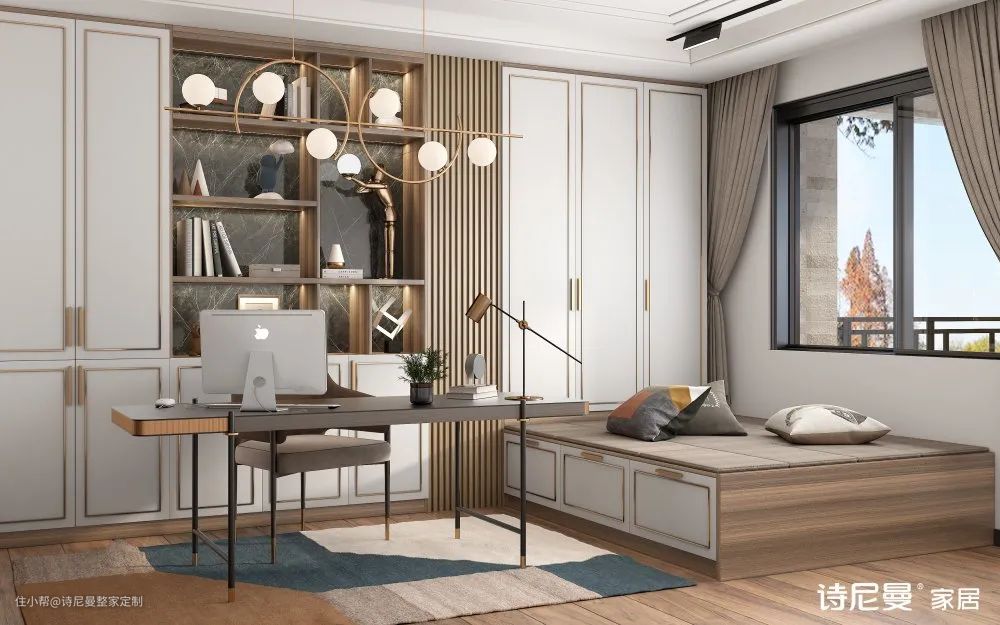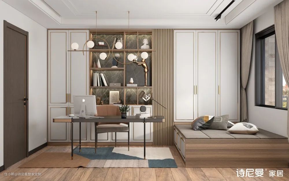 和主卧一样,书房的整面收纳柜不忘加入长城板起到丰富层次的作用,同时也运用了黑云岩防火板,强化书房的大气沉稳。