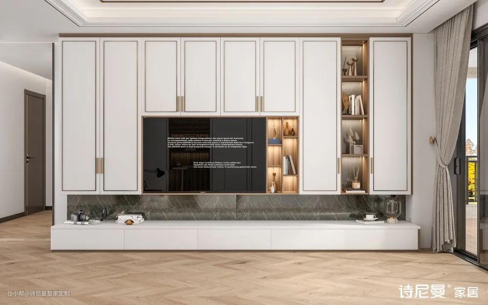 一整面墙的电视柜保证了充足的收纳空间,加上一点小巧思,适当留空做成开放格立马让电视柜充满设计感。摆放书籍和小摆件,有暖黄灯带的加持,瞬间打造出有格调有温度的会客空间。