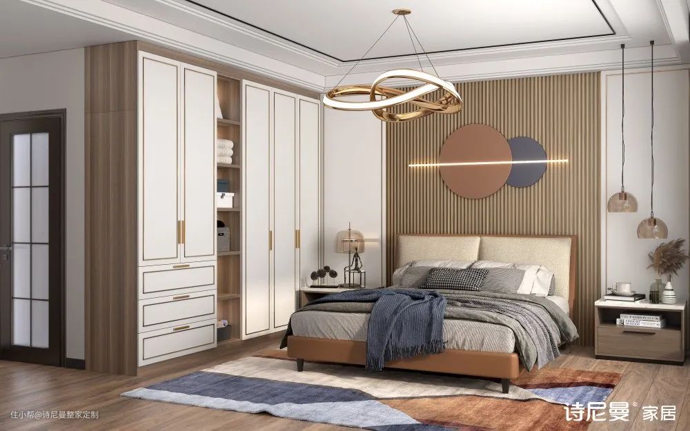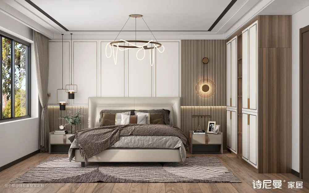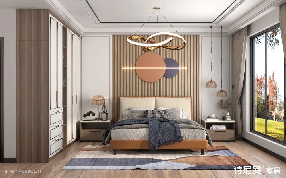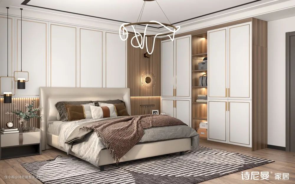 主卧的背景墙运用拼接拼色方式,通过运用原素墙板和长城板这两种不同材质、色调、纹理的有序组合,营造出有设计感有格调的休憩空间。