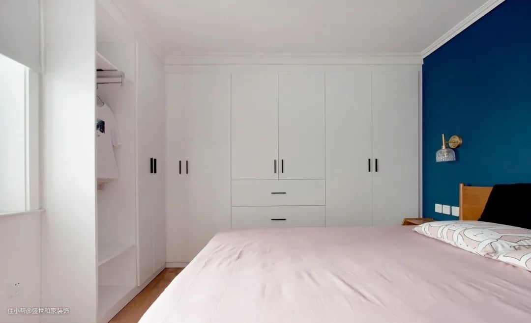 定制衣柜从床侧的一面墙转而延伸至床头墙面,不仅实现了空间的最大化利用,而且整体感也很强。
