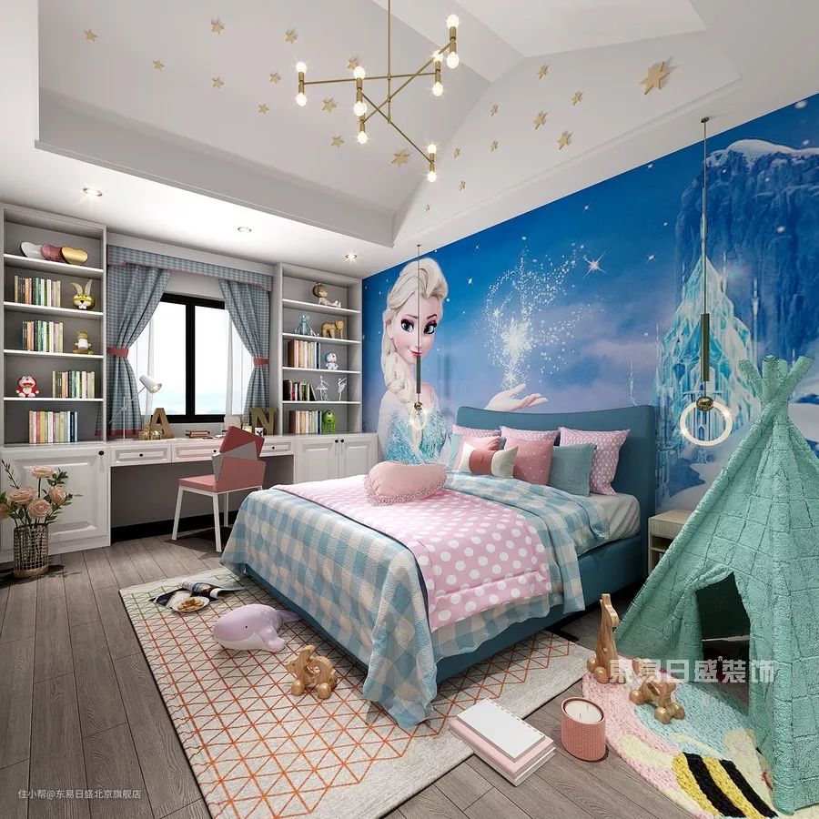 《冰雪奇缘》主题儿童房,深蓝色的天空,雪的白仿佛置身冰与雪的世界。