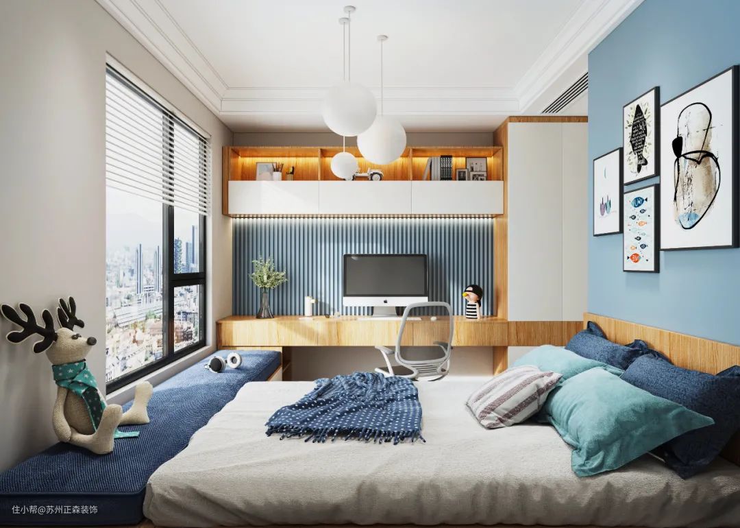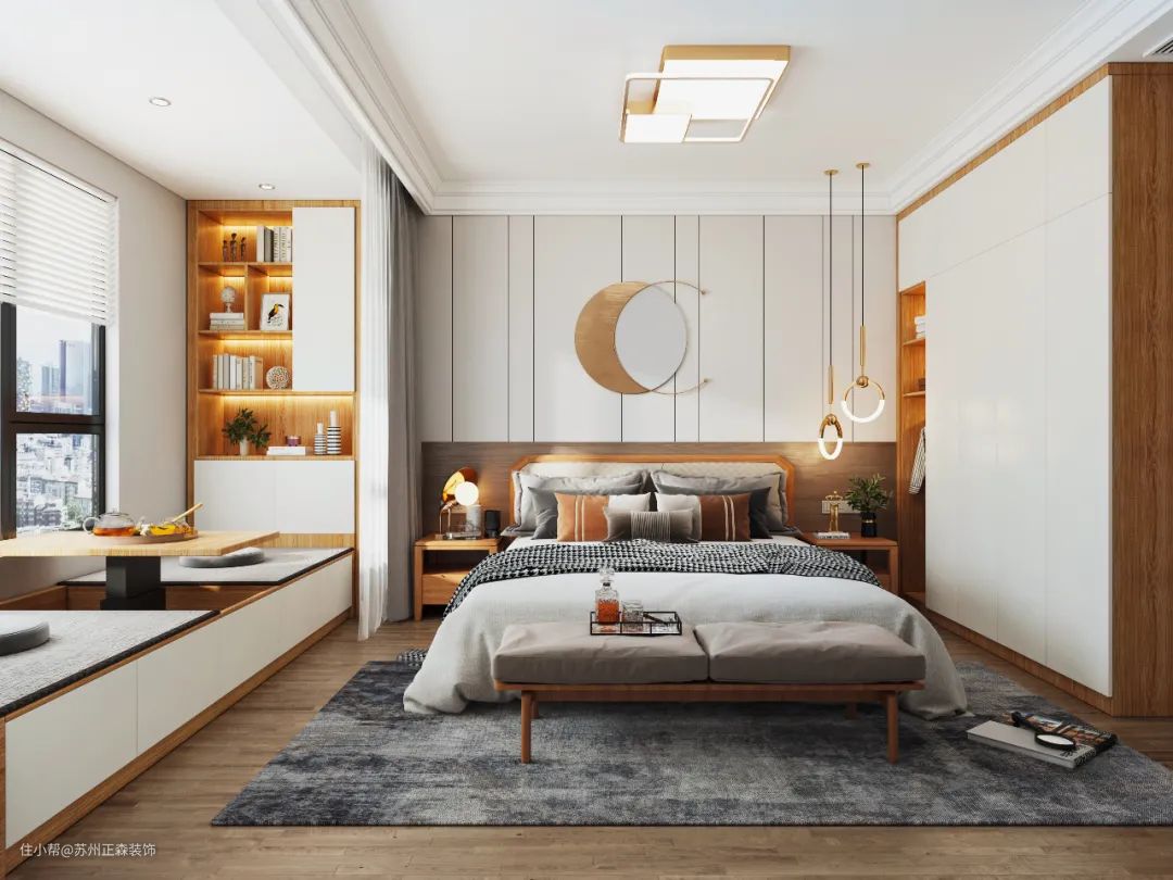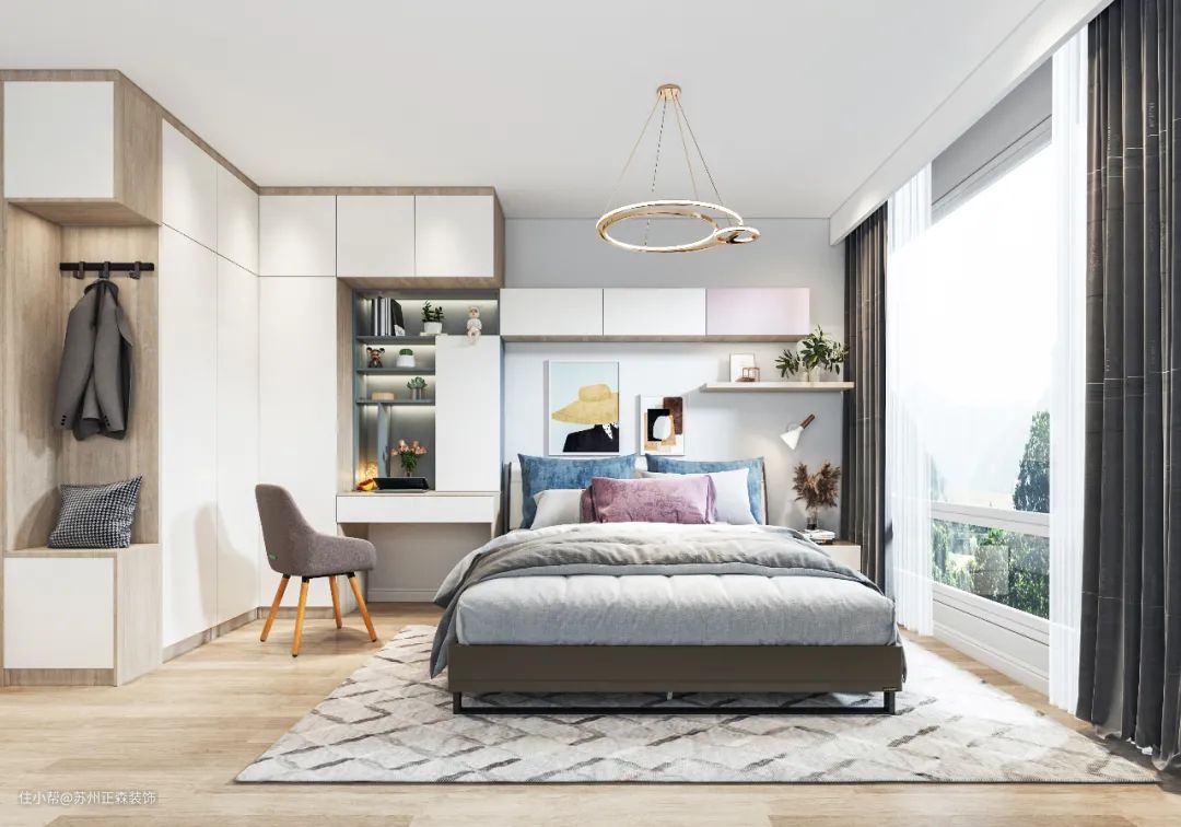 在功能性上,也通过打造“顶天立地”衣柜、一体式梳妆台、飘窗升降台等等……让卧室空间得到充分利用。