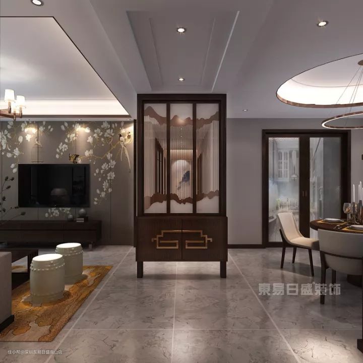 主要是以带有不同花格图案或不规则图案的透空木格栅屏作空间隔断,既优雅精致,又能产生通透与隐隔的视觉效果。