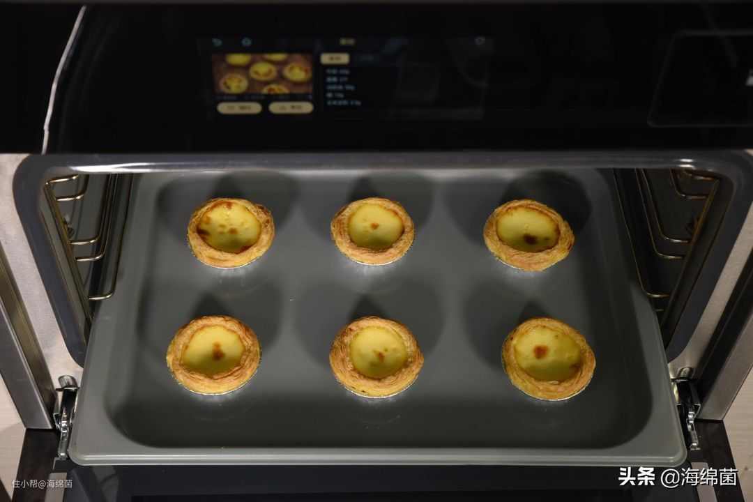 同时在容量方便,既然已经选择嵌入式了,就不要选择容量太小的,50-70L都是比较合理的选择,一般家用50-60其实已经足够了,烤整鸡或者大蛋糕都没有问题,因为嵌入式蒸烤箱左右宽度基本都是一样的(少数落后机型除外),容量的差别主要在纵向高度上。下图中的德普蒸烤箱是55L的陶瓷烤盘,因为一次吃不掉这么多,只做了六个蛋挞,可以看到摆盘间隔比较大,如果摆放紧凑一些的话,一次烤20个也是没有问题的,自己享用或和朋友分享相信是足够了。