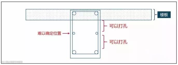 这种情况可以选择腰筋与上下排纵筋的中间区域进行打孔,但是,我们在实际打孔时很难确定腰筋的具体位置,也就很难确定打孔位置。