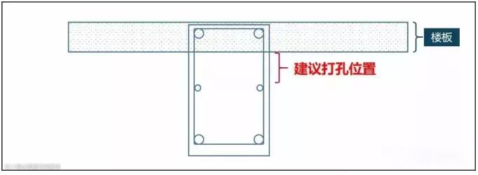 这种情况,上部位置可以在贴近楼板处进行打孔;下部位置可以在贴近距离梁下沿8cm处进行打孔。如果打下部位置,打孔有打断纵筋(主钢筋)的风险,而上部位置打孔只有打断腰筋的风险,所以我们建议尽量考虑上部位置打孔。