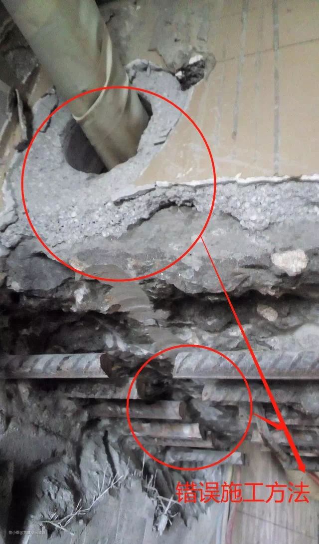 空调铜管走管,一般是贴梁贴壁铺设,打孔位置一般都在梁根区域(支座附近),所以在打孔过程中要尤其注意对箍筋的探测。