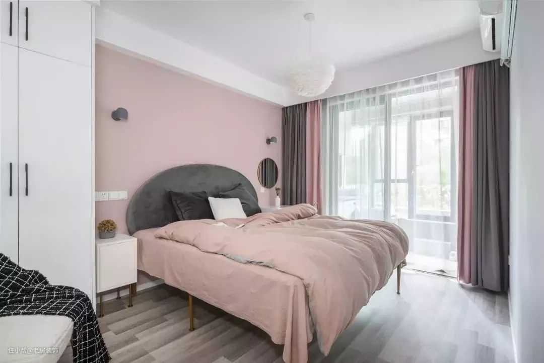 主卧室的内部是以粉色为主,背景墙和床品、窗帘都加入了粉色调,再加上细节处点缀一些金属元素,让整个卧室变得更加优雅、精致。