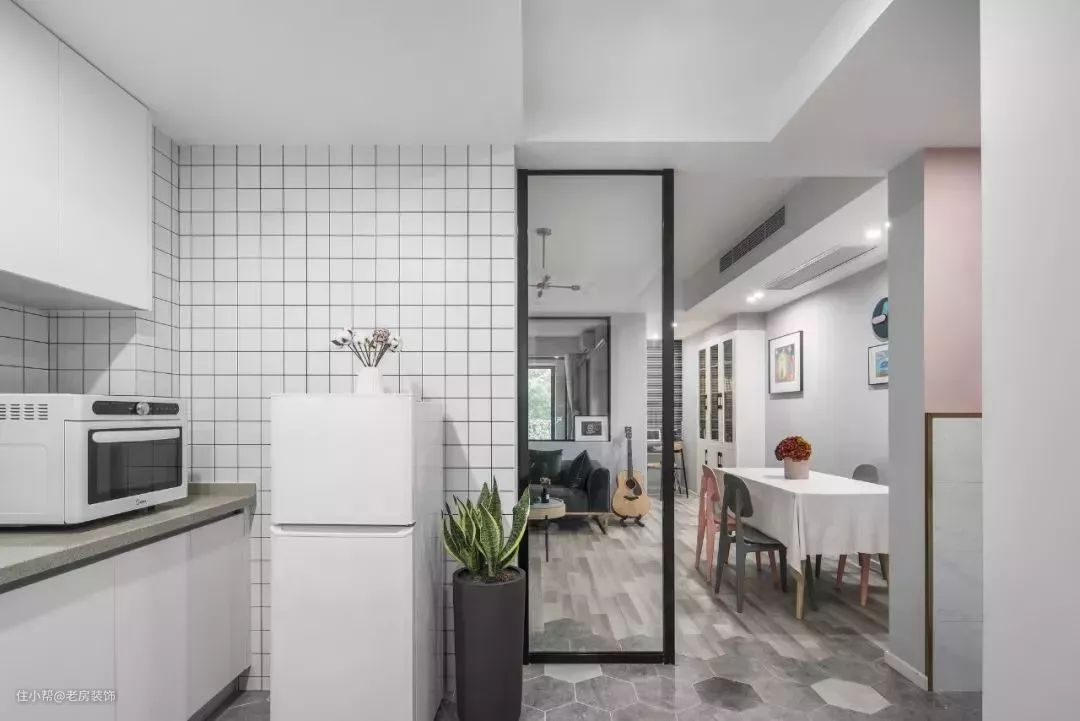设计师将户型调整了一下,大门入口的玄关改成了家用厨房跟卫生间的干区,那样回到家就可以把蔬菜放在灶台,和客餐厅之间用玻璃来作为隔断,地面铺贴文艺的六边砖,灰与白的结合带来轻松、惬意的感觉。